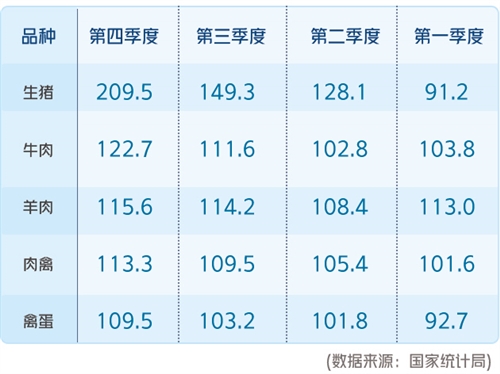 受疫情等因素影响,猪肉价格的上涨带动牛羊禽肉、鸡蛋等产品价格不同程度上涨,但市场生产供给比较充足,上涨幅度显著低于猪肉。从2019年各季度数据对比来看,牛羊肉三季度和四季度出现环比上涨态势,肉禽和禽蛋二季度、三季度和四季度均出现环比上涨。