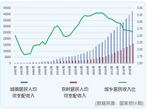2019年人均GDP突破1万美元大关,全国居民人均可支配收入达到30733元,较2018年增加2505元,实际增长5.8%。其中,农村居民人均可支配收入16021元,实际增长6.2%,比城镇增速高出1.7个百分点,城乡居民收入比由2018年的2.69:1缩小至2019年的2.64:1。从收入结构看,农村居民人均工资性收入6583元,占总收入比重为41.09%;人均经营净收入5762元,占比35.97%;人均财产净收入377元,占比2.35%;人均转移净收入3298元,占比20.59%。